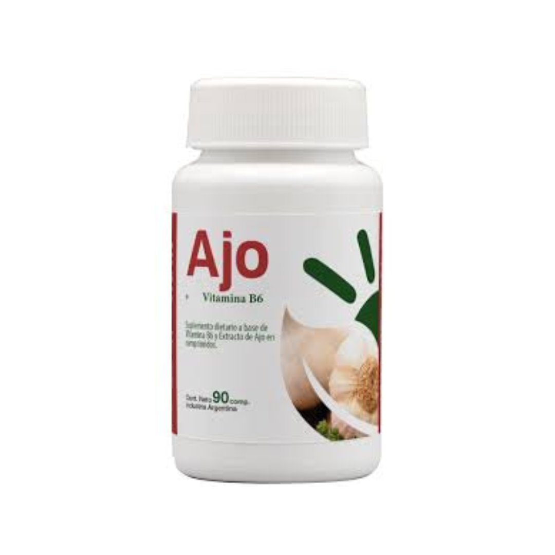 Suplemento dietario a base de vitamina B6 y extracto de ajo en comprimidos. El ajo (Allium sativum) es un vegetal ampliamente utilizado y contiene un gran número de compuestos bioactivos. La clave de los beneficios para la salud reside en su alto contenido de componentes azufrados. Los principales efectos positivos se relacionan con la salud cardiovascular y la eliminación de parásitos intestinales.